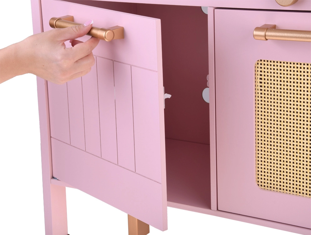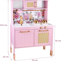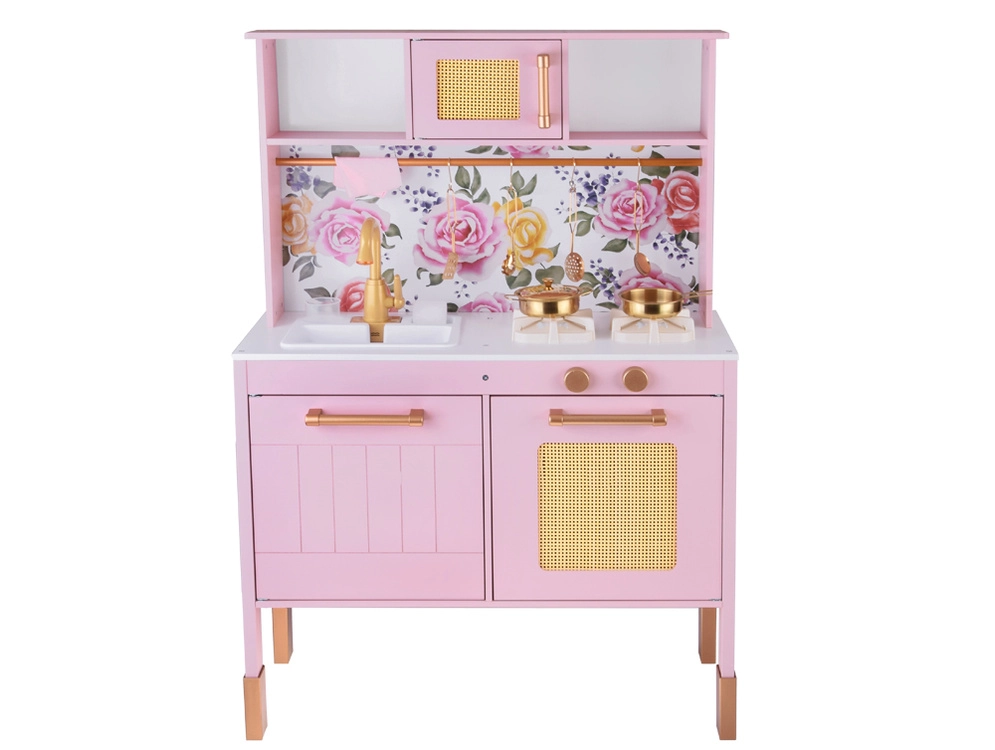 Ta retro drewniana kuchnia w delikatnym różowym kolorze łączy trwałe materiały z pięknymi detalami: złote uchwyty, kwiatowe tło i stabilne nóżki. Dzieci pokochają naśladowanie dorosłych dzięki świecącym palnikom z efektem gotowania i smażenia, obrotowym pokrętłom z klikaniem oraz zlewowi ze złotą baterią.
