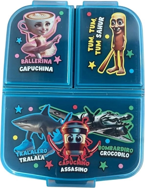Utrzymuj przekąski w porządku i świeżości. Ten wytrzymały multibox z motywem Italian Brainrot zapewnia sprytne rozplanowanie: jedna pojemna przegroda na kanapkę oraz dwie mniejsze na owoce, warzywa lub drobne smakołyki. Dzięki solidnemu wykonaniu sprawdzi się w codziennym użytkowaniu i zniesie przypadkowe upadki.