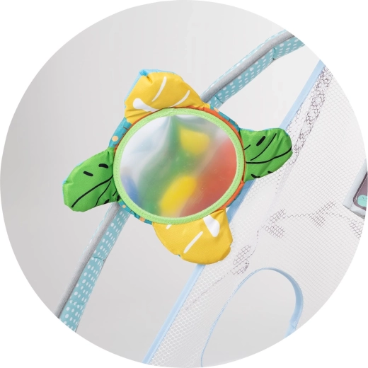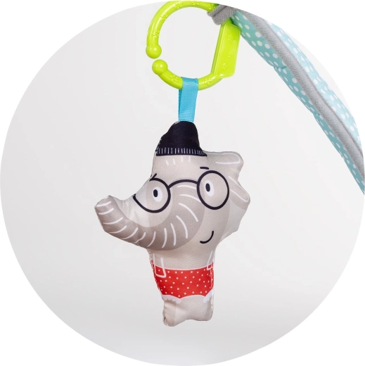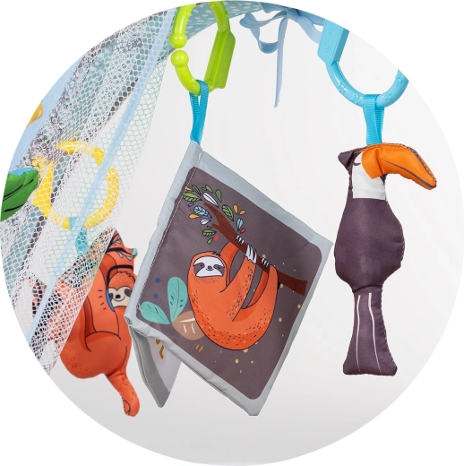 Zawieszane zabawki, lusterko oraz efekty dźwiękowe i świetlne wspierają wzrok, słuch i ciekawość, motywując maluszka do ruchu i sięgania.