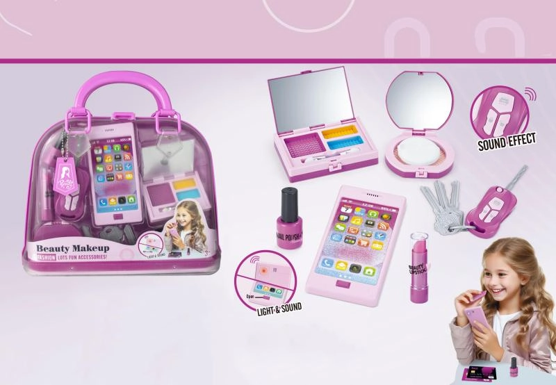 Dziecięca torebka, telefon komórkowy (zabawka), pęk kluczy, kluczyki do auta, makijaż/szminki (zabawki), karty płatnicze (zabawki)