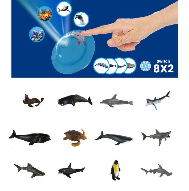 Zestaw łączy światło, kolory i realistyczne modele zwierząt, dzięki czemu dzieci łatwo połączą obraz z rzeczywistością. Projektor z dwoma krążkami wyświetla na ścianie lub suficie morskie motywy, które są łatwe do obserwowania i inspirują do opowiadania historii.