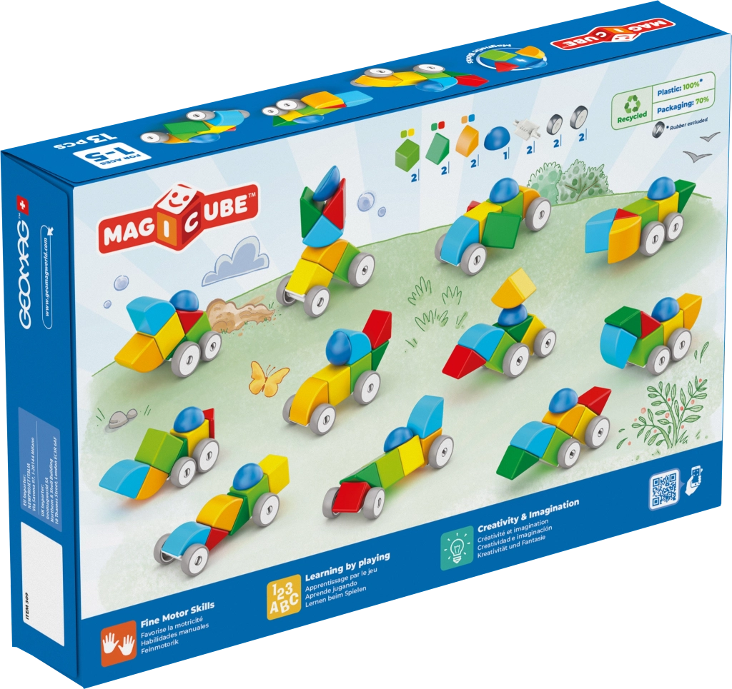 Odkryj zabawną magnetyczną układankę Geomag Magicube z 13 elementami, która rozwija kreatywność, małą motorykę i myślenie logiczne u dzieci już od 1 roku. Zestaw z tworzywa z recyklingu zawiera magnetyczne kształty oraz kółka z podwoziami do budowy kolorowych autek i innych konstrukcji.
