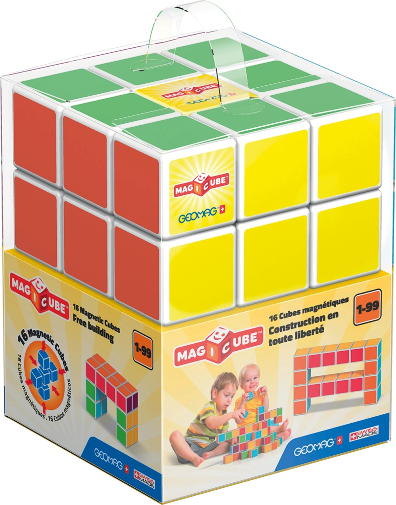 Buduj, odkrywaj i ucz się z kolorowymi magnetycznymi klockami Geomag Magicube. Dzięki unikalnej konstrukcji klocki przyciągają się ze wszystkich stron, oferują nieskończone możliwości budowania i wspierają małą motorykę, wyobraźnię przestrzenną oraz logiczne myślenie. Każda ścianka ma inny kolor, co czyni z klocków świetną pomoc edukacyjną do domu i szkoły. Zestaw zawiera 16 magnetycznych klocków wyprodukowanych w Szwajcarii z plastiku z recyklingu, odpowiednie od 1 roku.