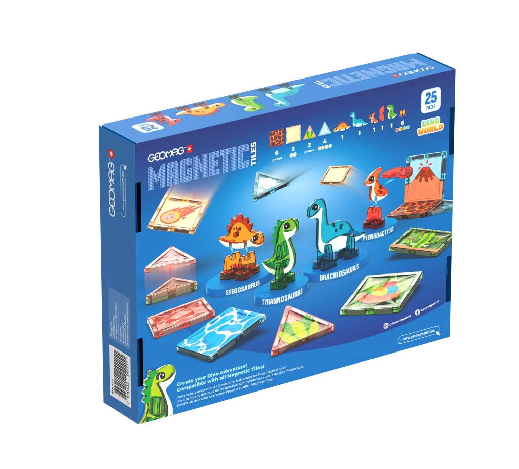 Odkryj zabawną magnetyczną układankę Geomag Magnetic Tiles Dino z łącznie 25 elementami i 4 uroczymi dinozaurami. Dzięki magnesom na wszystkich krawędziach elementów dzieci z łatwością tworzą figury 2D oraz struktury 3D. Zestaw rozwija sprawność manualną, kreatywność i wyobraźnię, uczy kolorów i kształtów geometrycznych. Odpowiednie dla dzieci od 3 lat.