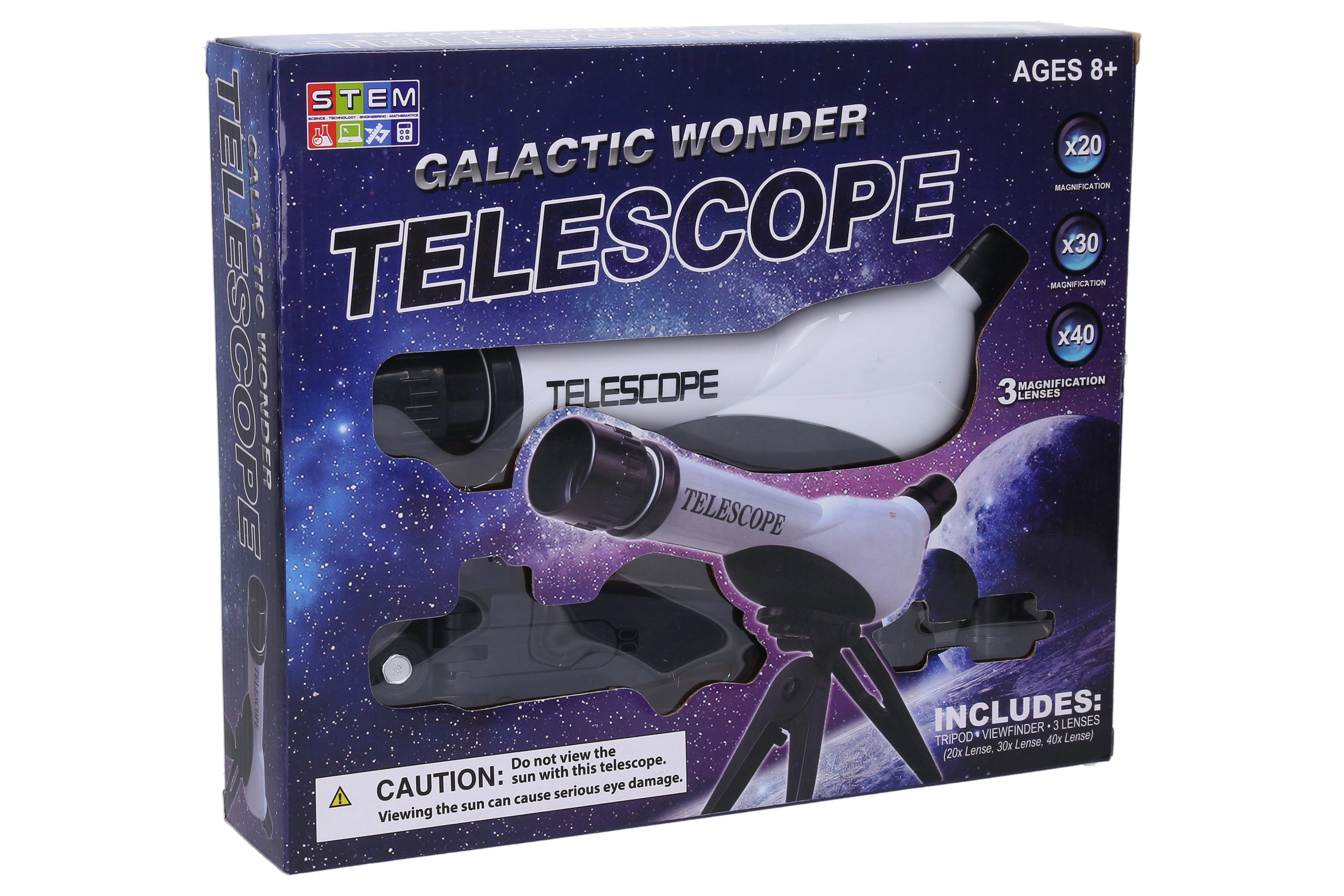 Odkryj nocne niebo z tym kompaktowym teleskopem astronomicznym dla początkujących i ciekawych świata dzieci. Oferuje powiększenia 20×, 30× i 40×, wymienne soczewki dla różnych poziomów zbliżenia oraz stabilny statyw dla wygodnej obserwacji. Proste ustawianie ostrości poprzez obracanie obiektywu ułatwia uzyskanie ostrego obrazu, który przy obserwacji przez teleskop jest lustrzanie odwrócony (właściwość optyczna).