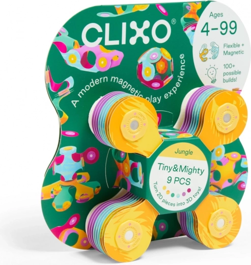 Clixo Tiny & Mighty Jungle to radosna magnetyczna układanka inspirowana origami, łącząca lekkość, elastyczność i bezpieczeństwo. Elementy w kształcie czterolistnej koniczyny dzięki silnym magnesom łatwo łączą się w konstrukcje 2D i 3D, umożliwiając obrót 360° z blokadą w 24 pozycjach dla maksymalnej stabilności. W pastelowych kolorach z graficznym nadrukiem zbudujesz rośliny, zwierzęta i własne fantastyczne stworzenia.