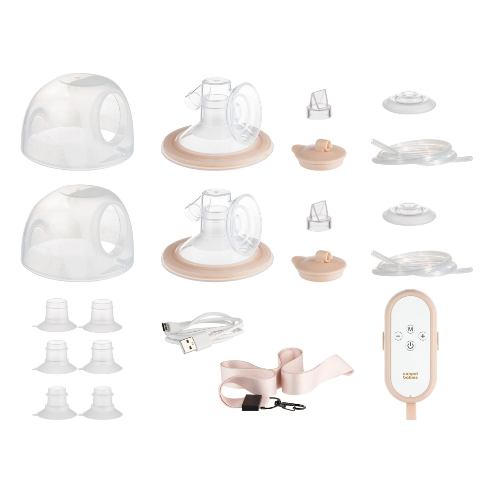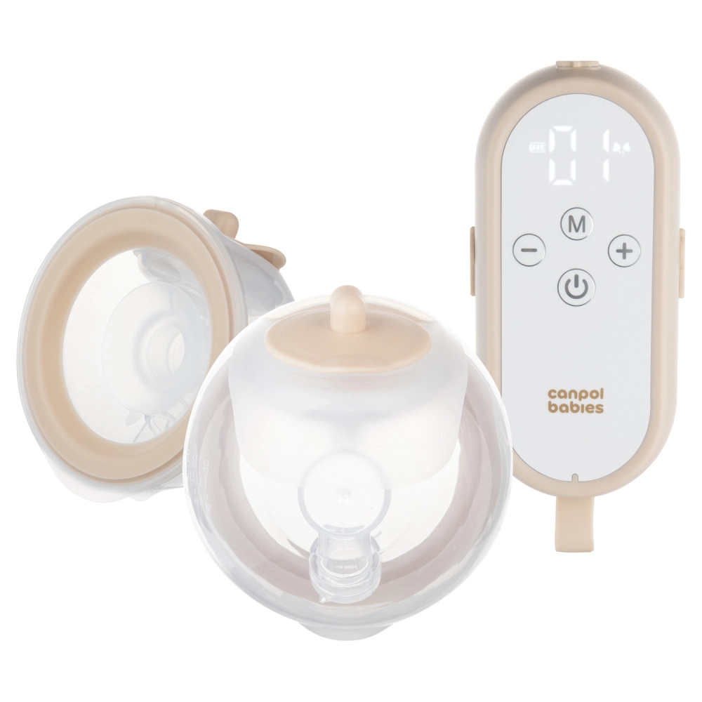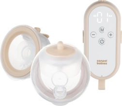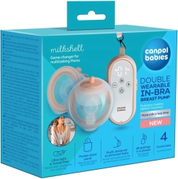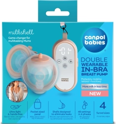 Canpol babies MilkShell to nowoczesny podwójny bezprzewodowy laktator do biustonosza zaprojektowany dla wygodnego, dyskretnego i efektywnego odciągania. Bardzo lekkie pojemniki (180 ml każdy) z miękkim lejkiem idealnie mieszczą się w biustonoszu, dzięki czemu możesz odciągać bez użycia rąk w domu i w podróży. Jednostkę sterującą z czytelnymi przyciskami można nosić na szyi dzięki smyczy – wszystko jest pod ręką i gotowe do użycia.