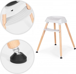 5‑punktowe pasy, element między nogami i stabilne drewniane nogi z antypoślizgowymi końcówkami chronią dziecko przed zsunięciem i zapewniają maksymalną stabilność.