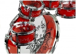 - Kompletny zestaw – 6 bębnów, talerz, pedał, pałeczki, stołeczka.