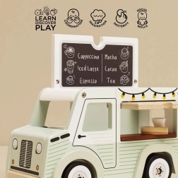 Odkryj urok mobilnej kawiarni w dziecięcym wydaniu. Mobilna kawiarnia Le Toy Van Street Coffee wyróżnia się delikatnym pistacjowym odcieniem zieleni i bielą, dopracowanymi ilustracjami oraz przemyślanymi funkcjami, które wciągają dzieci w świat wyobraźni. Daszek łatwo się otwiera, a w środku znajdziesz menu z ofertą kaw i herbat; przednie okienko wydawcze pozwala obsługiwać „klientów” jak w prawdziwej kawiarni.