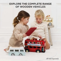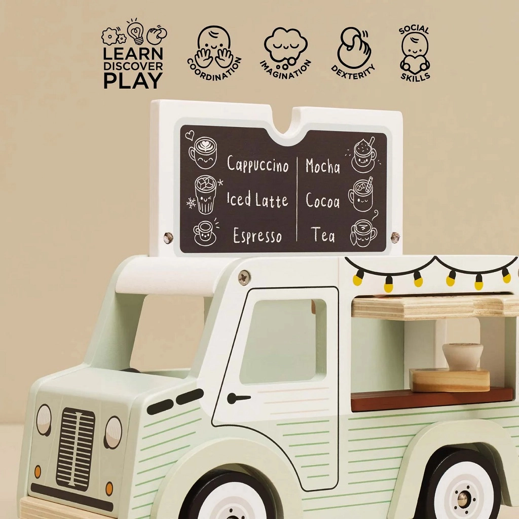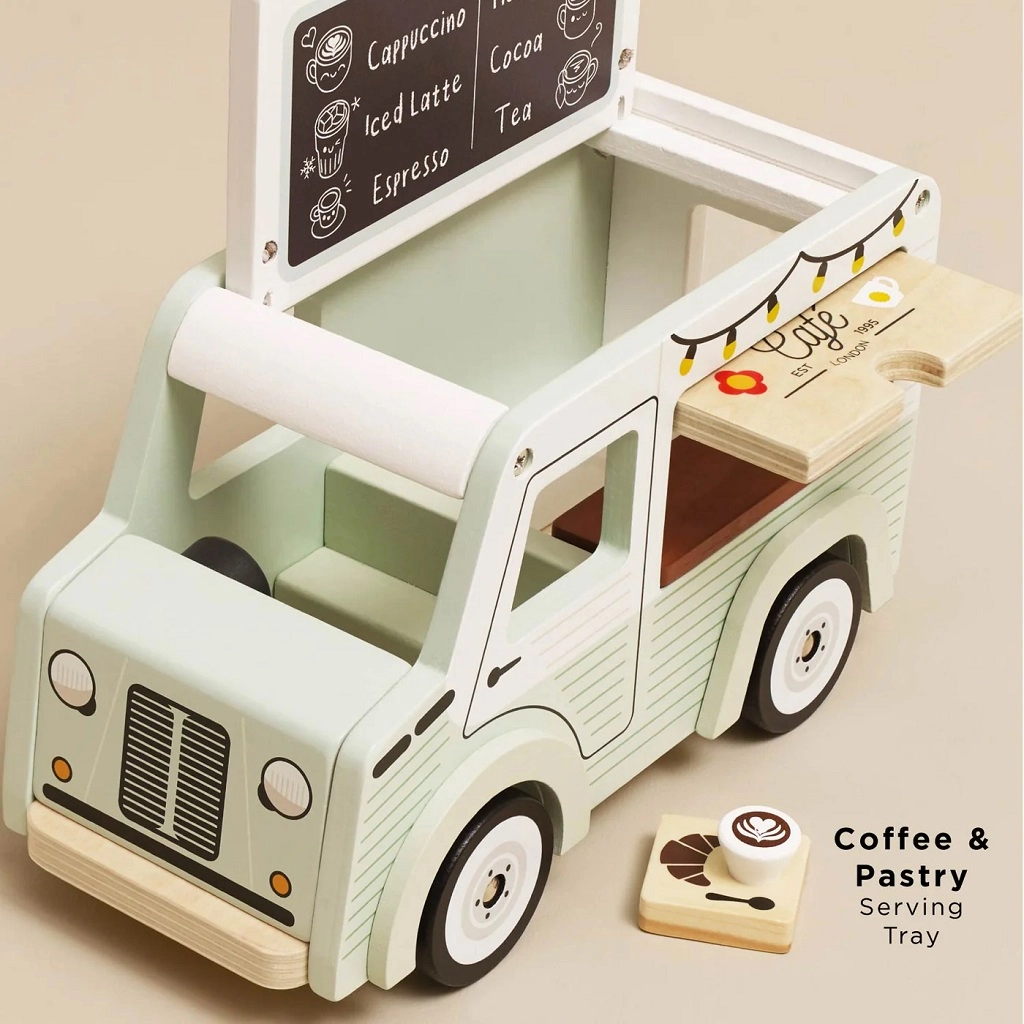 Stylowa mobilna kawiarnia od Le Toy Van ucieszy małych baristów swoim retro designem i wysoką jakością wykonania z drewna z certyfikatem FSC. Oferuje otwierany daszek, okienko wydawcze oraz tacę do serwowania z akcesoriami dla realistycznej zabawy. Jest ręcznie domalowana nietoksycznymi, wodnymi farbami i wspiera kreatywność oraz zabawy w odgrywanie ról.
