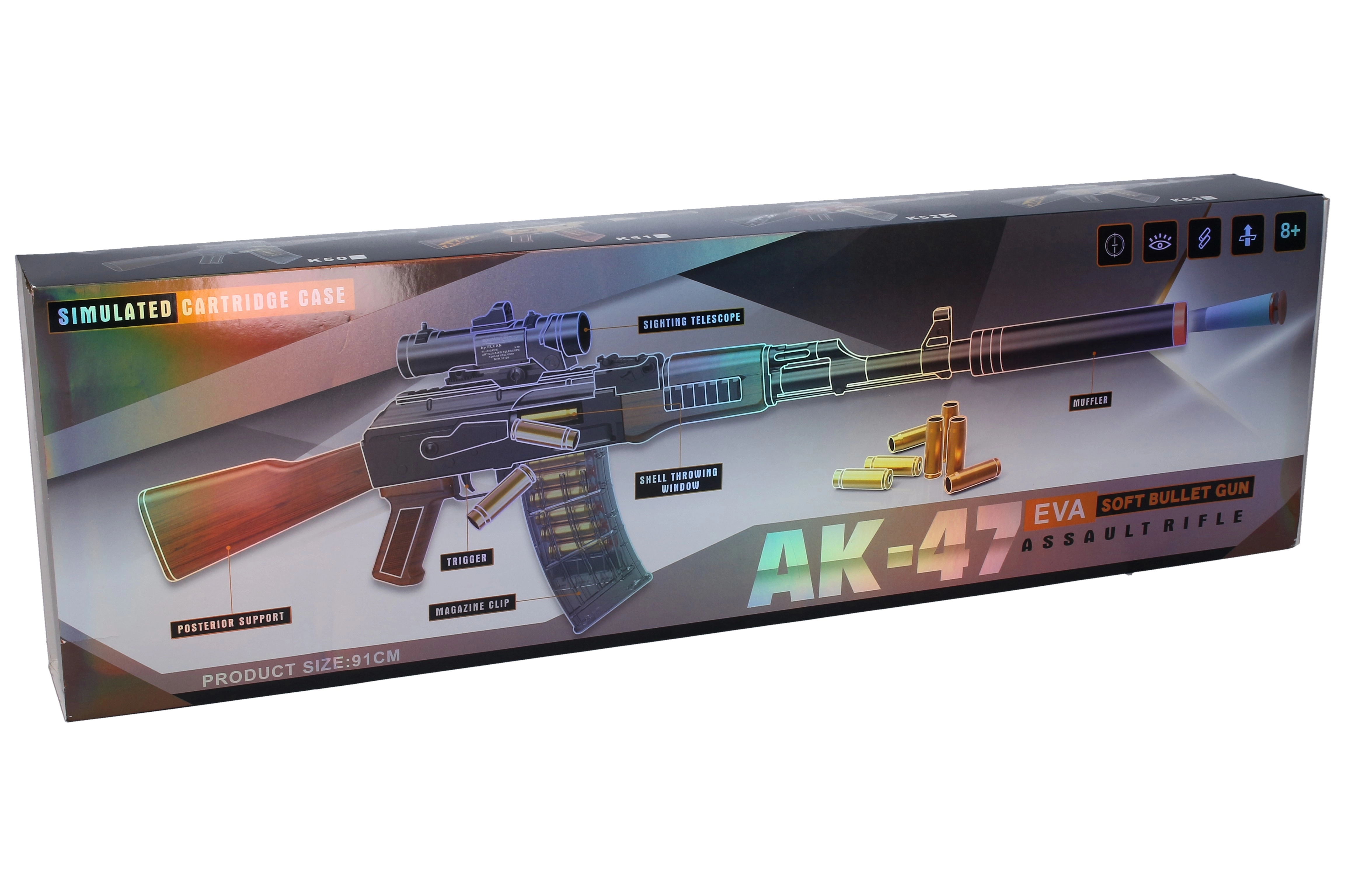 Realistyczny dziecięcy karabin inspirowany modelem AK-47 zapewnia świetną zabawę i bezpieczne strzelanie. Zawiera konstrukcję rozkładaną, tłumik i muszkę ze szczerbinką, 8 nabojów oraz 20 piankowych strzałek (10 standardowych, 10 z przyssawką). Długość 91 cm, z ilustrowaną instrukcją ułatwiającą montaż i użytkowanie.