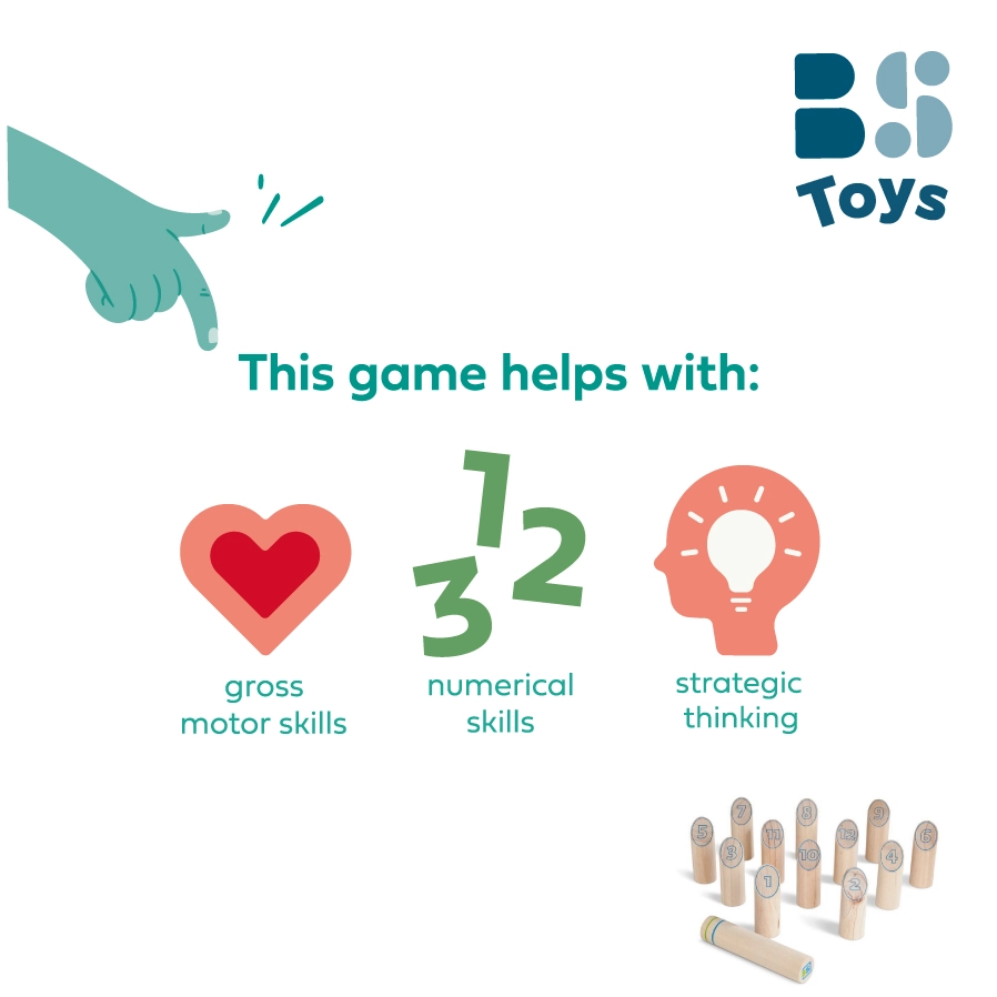 Dzięki prostym zasadom angażuje wszystkie pokolenia. Mölkky rozwija motorykę, precyzję, koncentrację i myślenie taktyczne, a jednocześnie wspiera liczenie i pracę z liczbami. Lekki i łatwy do przenoszenia zestaw świetnie sprawdzi się na wycieczkach, wakacjach i popołudniach w ogrodzie.