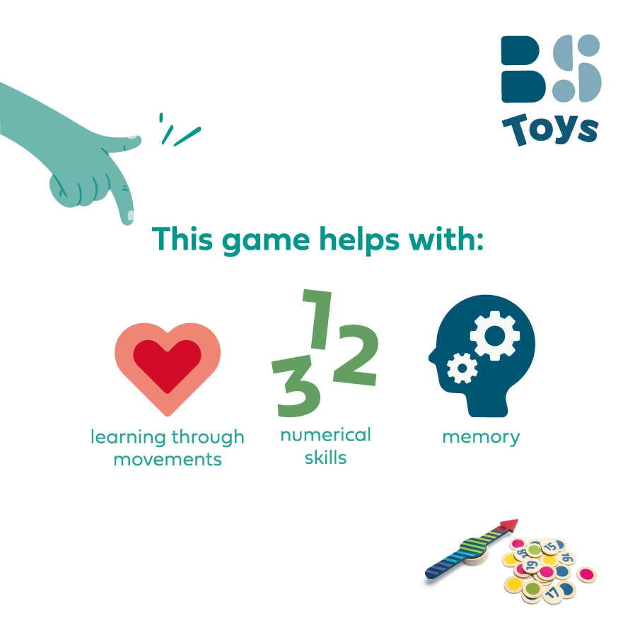 Zabawna i wszechstronna drewniana gra dla dzieci od 4 lat, łącząca rozpoznawanie kolorów, naukę liczb oraz wyzwania ruchowe. Zakręć strzałką, wybierz kolor lub liczbę i wykonuj pomysłowe zadania – od „znajdź zielony przedmiot” po „skocz 10×”. Wytrzymałe drewniane elementy, 24 dwustronne żetony i duża obracająca się strzałka zapewniają zabawę dla 2 i więcej graczy w domu i na zewnątrz.