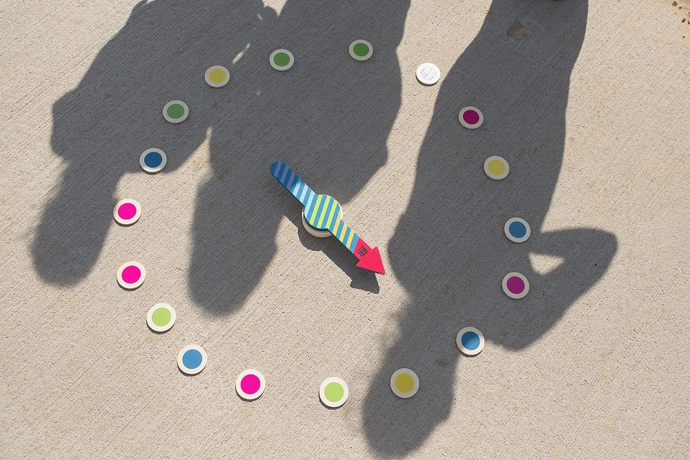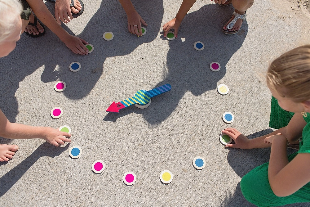 Jak grać: gracze stają wokół strzałki, zakręcają nią, a osoba lub zadanie, na które wskaże strzałka, określa kolor lub liczbę. Następnie wszyscy wykonują wyzwanie – od szukania przedmiotów według koloru po szybkie liczenie i skakanie.