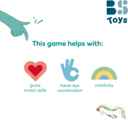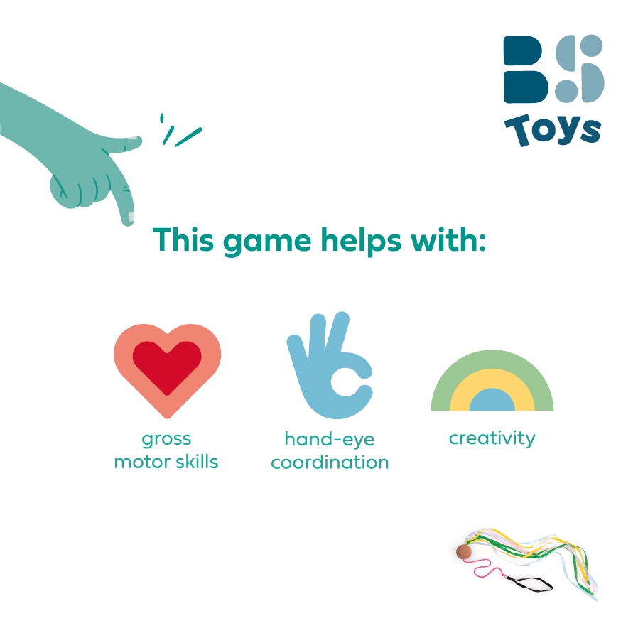 Świetnie sprawdzi się do zabawy w domu, w świetlicach szkolnych i na zajęciach ruchowych. Długie wstążki zapewniają atrakcyjny efekt wizualny, a korkowa kula stanowi przyjemne, bezpieczne obciążenie dla płynnych obrotów.