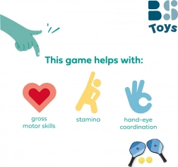 W opakowaniu znajdziesz kompletny sprzęt dla 2 graczy: 2 drewniane paletki (40 × 19 cm), 2 piłki, przenośną siatkę oraz torbę do łatwego przechowywania i transportu. Zasady opanujesz w kilka chwil, a grać możesz nawet na mniejszym boisku – na przykład na szkolnym dziedzińcu lub w sali gimnastycznej.
