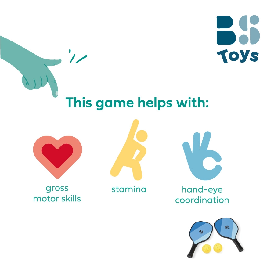 Odkryj rodzinną grę rakietową: pickleball. Ten zestaw zawiera wszystko, czego potrzebujesz, aby zacząć grać od razu – 2 paletki, 2 piłki, siatkę oraz torbę transportową. Gra jest łatwa do nauki, przyjazna dla początkujących i świetnie rozwija koordynację oko–ręka, wytrzymałość i motorykę dużą.