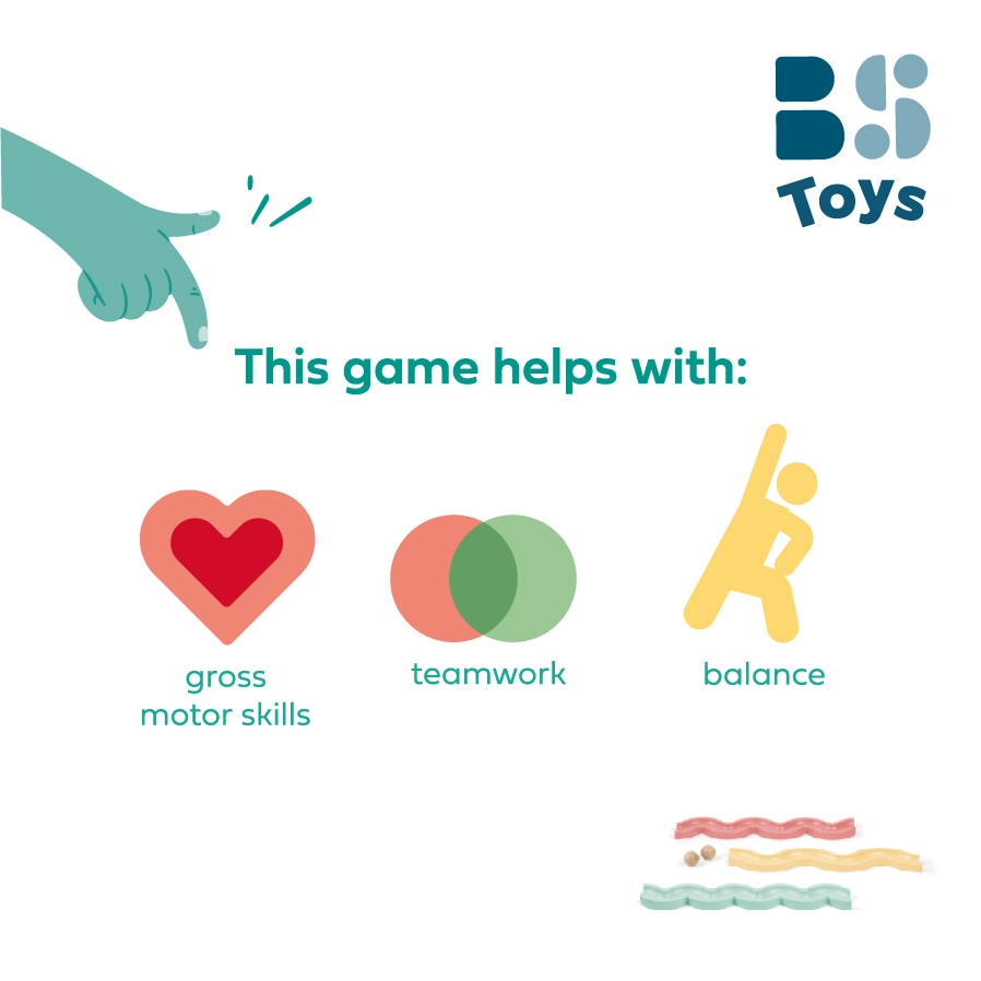 Ten zespołowy tor kulkowy zapewnia dynamiczną zabawę ruchową dla 1–3 graczy. Dzieci trzymają poszczególne elementy toru i wspólnie starają się płynnie przenosić kulkę z jednego segmentu na drugi, nie dopuszczając do jej upadku. Dzięki przemyślanym krzywiznom i gładkim krawędziom ruch kulki jest płynny i bezpieczny.