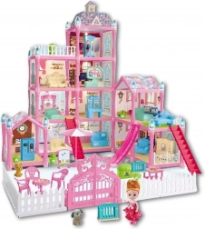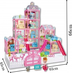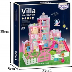 • Bogaty zestaw 275 elementów: domek do złożenia, lalka, piesek, ogródek z płotem i bramą, stół i krzesła, sofa, łóżko, szafa, lodówka, schody, zjeżdżalnia i inne.