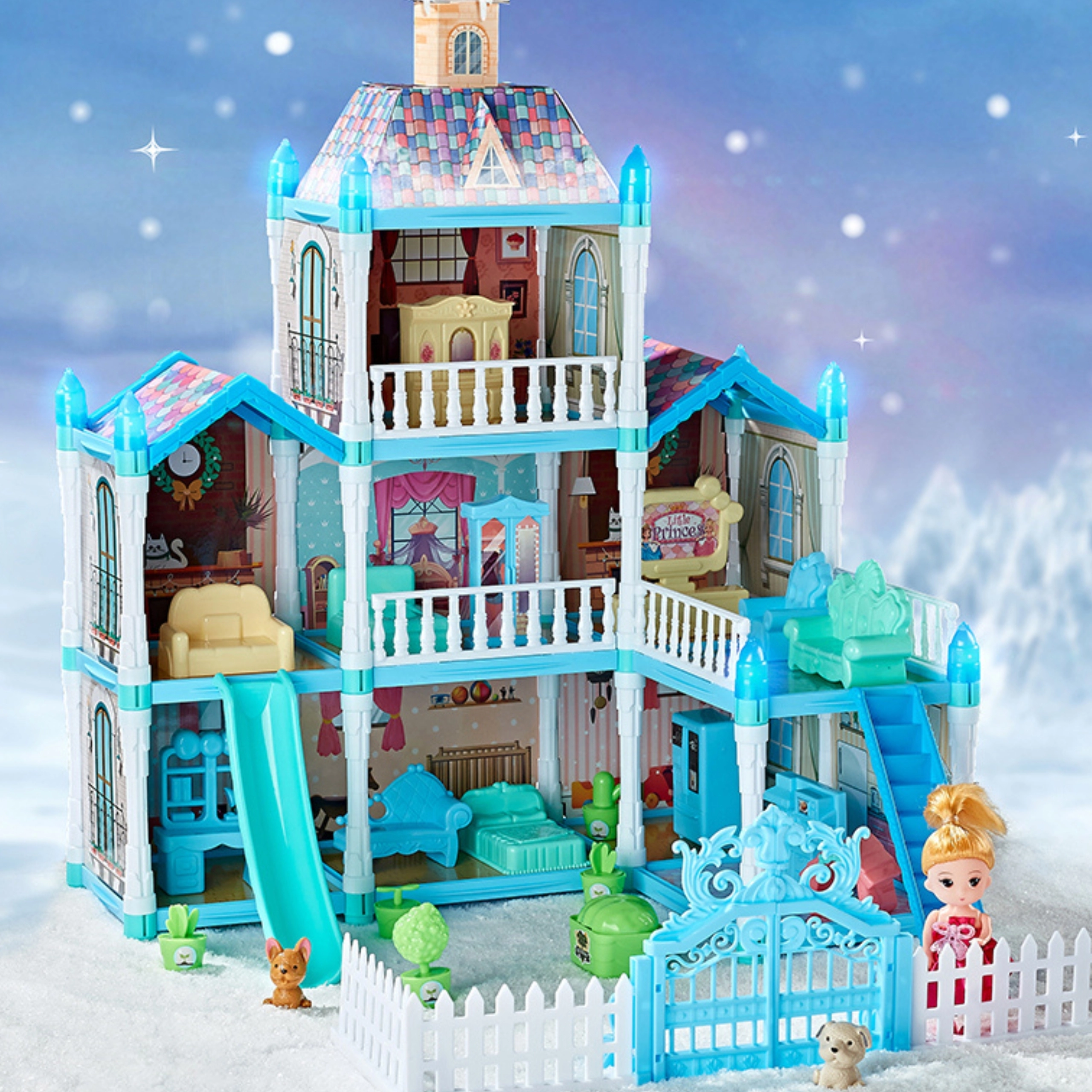 Ten przestronny, trzypoziomowy pałac dla lalek zapewnia dzieciom godziny kreatywnej zabawy. Dzięki 191 elementom mogą projektować wnętrza, opiekować się lalką i jej zwierzęcymi przyjaciółmi, a także cieszyć się podświetlanymi dekoracjami, które rozświetlą zabawę po zmroku. Niebiesko‑różowa estetyka tworzy atmosferę zimowego zamku i ogrodu.