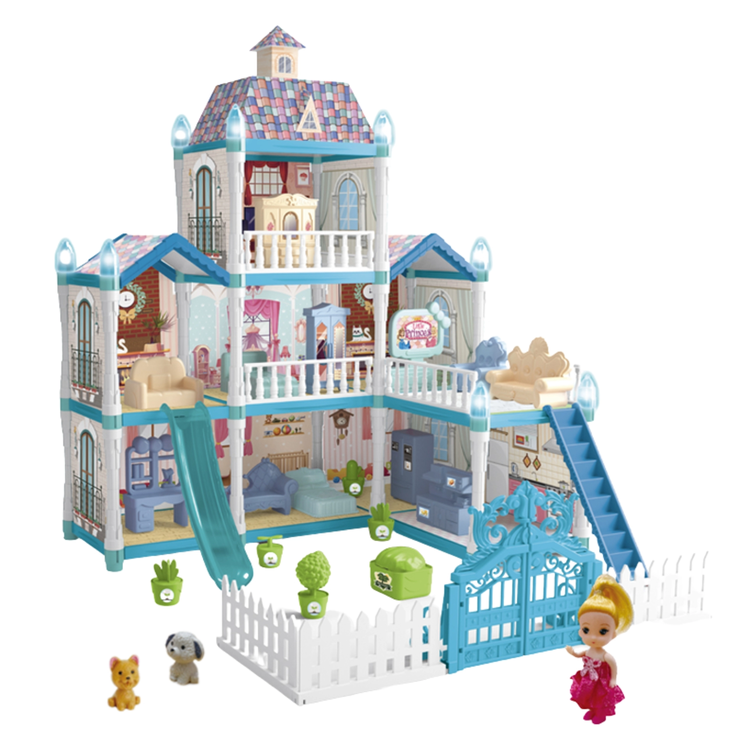 - Domek, lalka, 2 zwierzątka (pies, kot), meble i dodatki ogrodowe, świetlne dekoracje
