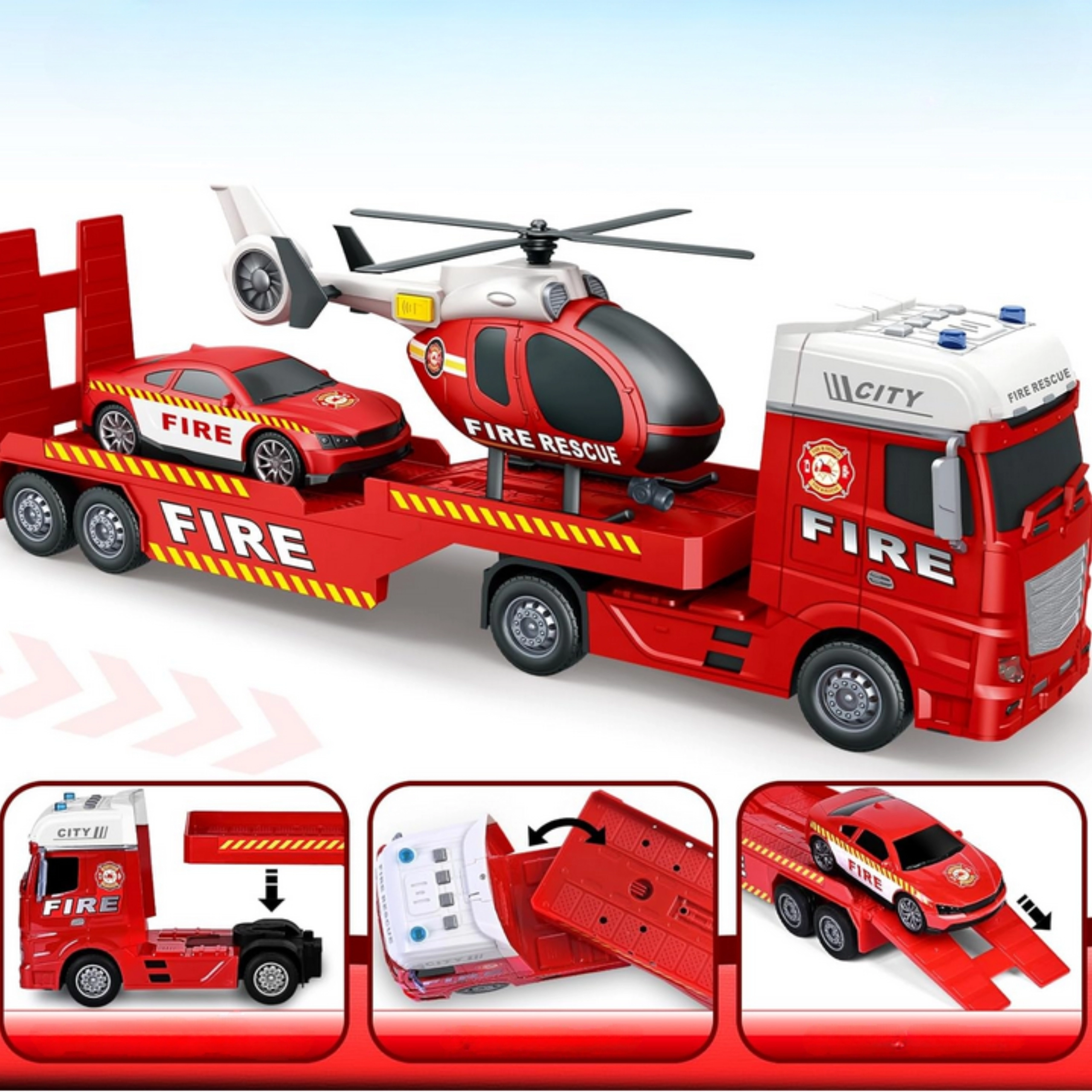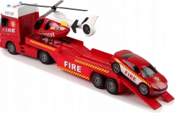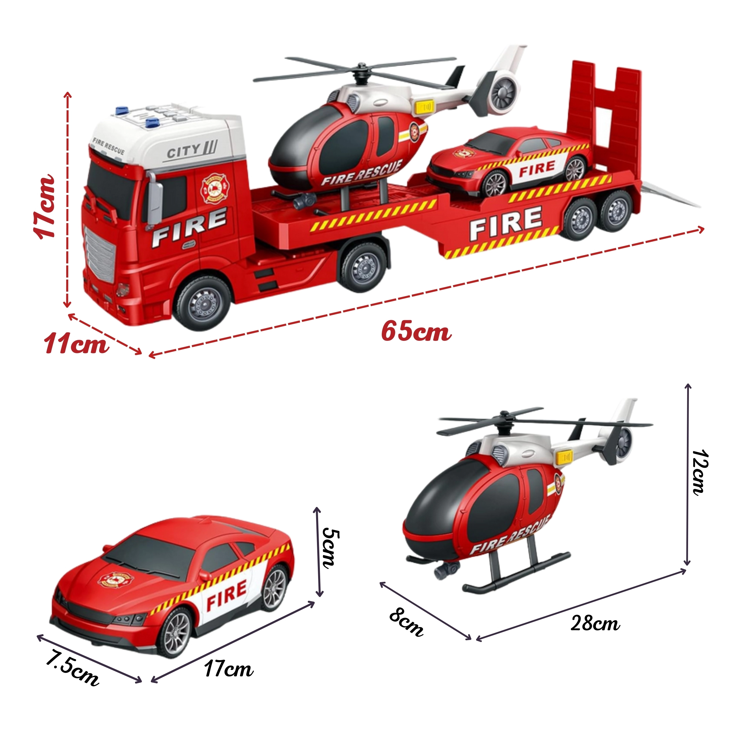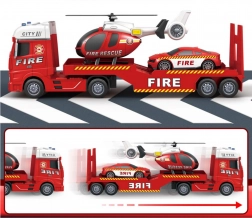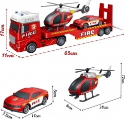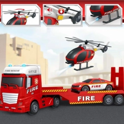 • Zawartość opakowania: holownik z miejscem do przewozu aut, mały wóz strażacki, helikopter z ruchomym wirnikiem.