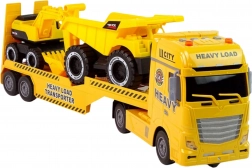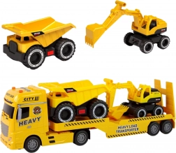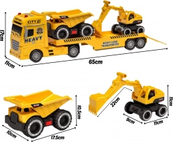 Odkryj duży zestaw budowlany, który ucieszy wszystkich małych fanów maszyn. Laweta z ruchomą rampą załadunkową łatwo załaduje i rozładuje dołączone pojazdy. Realistyczne migające koguty oraz dźwięki silnika, klaksonu i syreny uruchamiane przyciskami dodają zabawie autentyczności. Koparka ma ręcznie sterowane ramię z łyżką, a wywrotka jest wyposażona w uchylną skrzynię do „wysypywania materiału”.