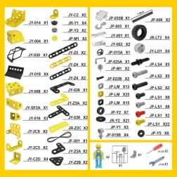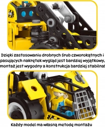218 elementów konstrukcyjnych, 2 figurki pracowników, narzędzia dla figurek, śrubokręt, klucz nastawny, książeczka z instrukcjami montażu