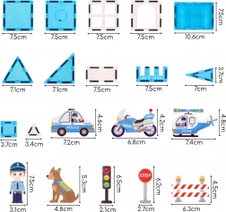 Magnetyczne panele o różnych kształtach, figurki policjantów, pies policyjny, radiowóz, helikopter, motocykl, znaki drogowe, barierki, naklejki