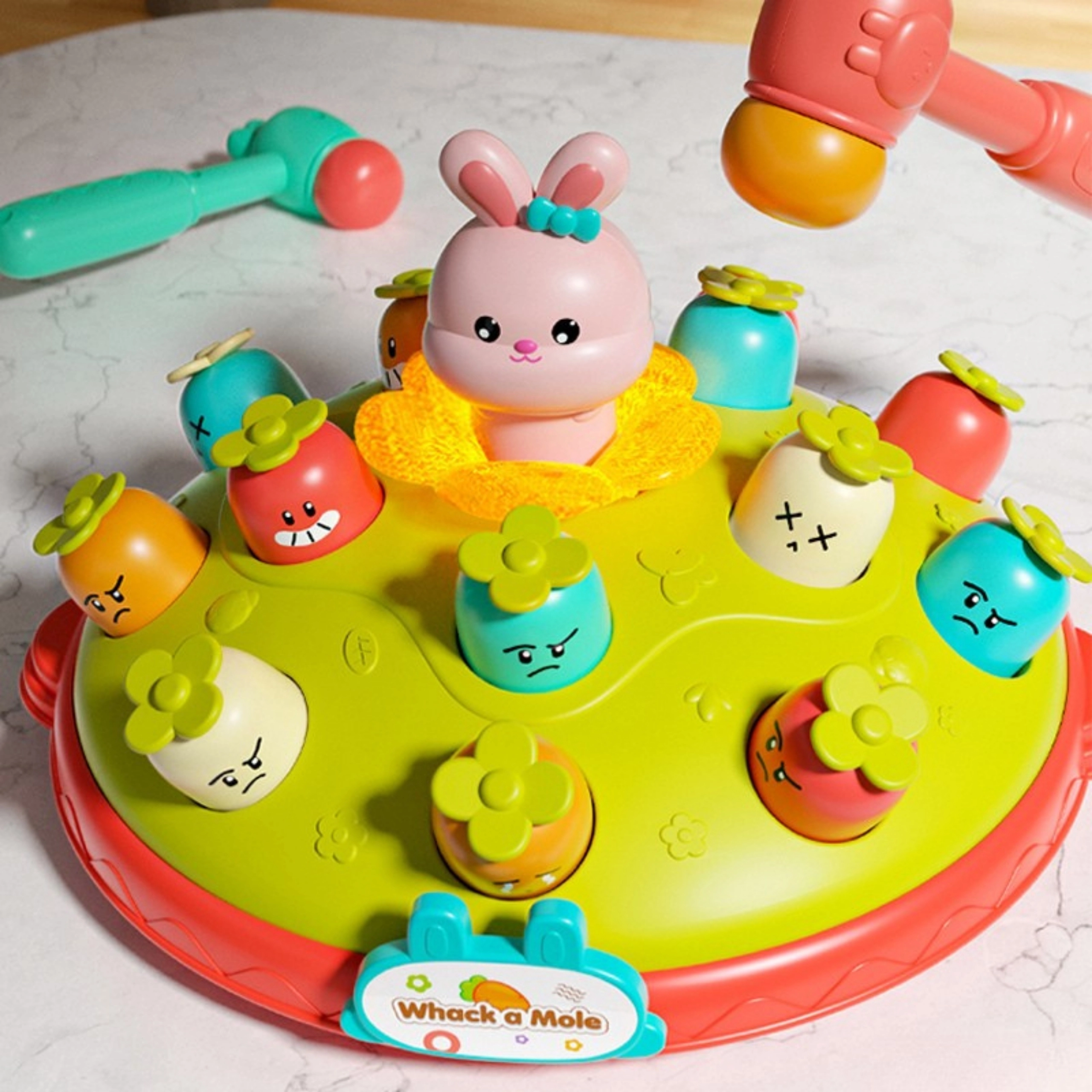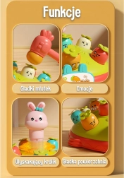 Zabawna i bezpieczna interaktywna gra marki WOOPIE zapewnia dzieciom od 18 miesięcy godziny radości i nauki. Dzieci uderzają miękkim młotkiem w „krety”, poprawiając w ten sposób refleks, koordynację oko–ręka oraz koncentrację. Kolorowe światełka, wesołe melodie i przyjazny design z marchewkami i króliczkami zwiększają motywację do zabawy. Gra wykonana jest z wysokiej jakości materiałów, ma gładkie krawędzie i miękki młotek dla maksymalnego bezpieczeństwa małych rączek.