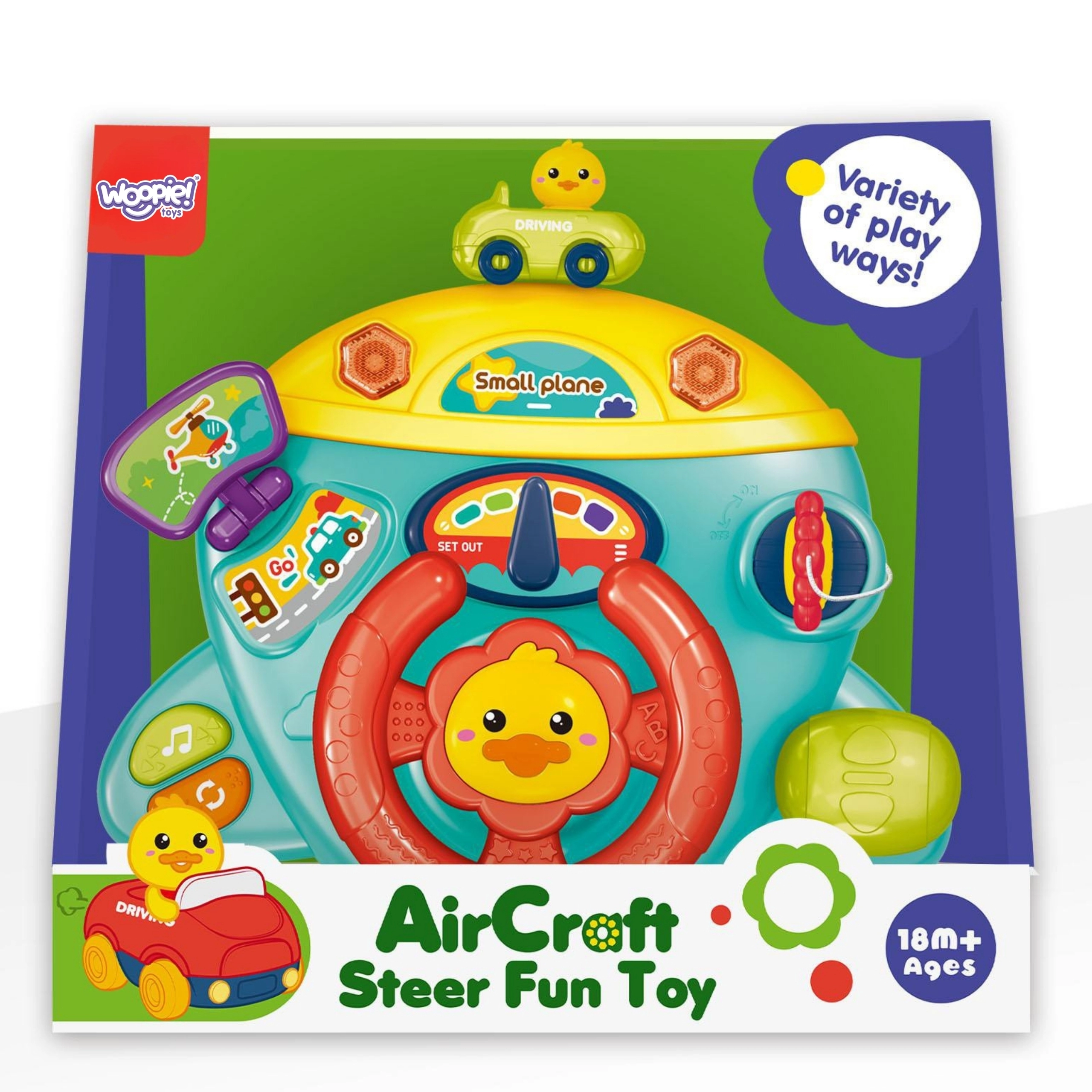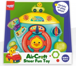 Mali piloci mogą obracać kaczą kierownicą, uruchamiać pojazd za pomocą kluczyka, obserwować ruchomy prędkościomierz i lusterko, a pojazd na górnej części samolotu porusza się po torze w lewo i w prawo. Zabawka wspiera rozwój małej motoryki, percepcji sensorycznej oraz naukę związków przyczynowo‑skutkowych.