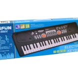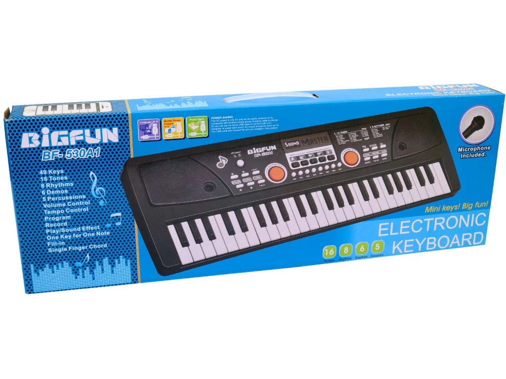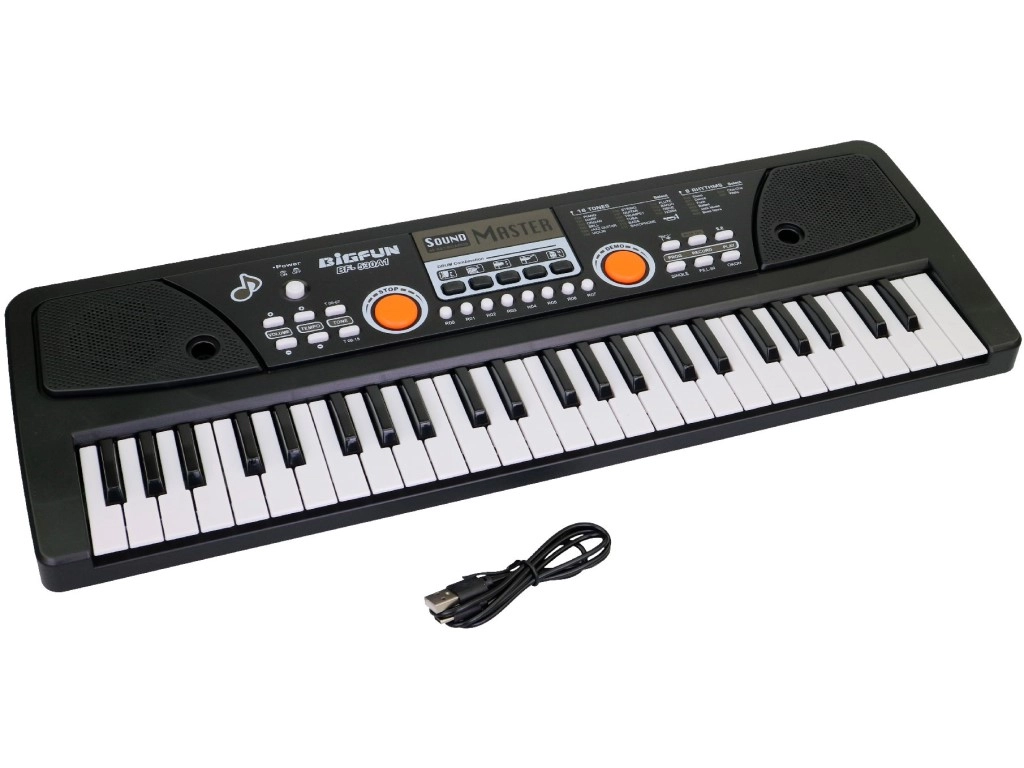 Odkryj radość z muzyki z dziecięcym elektronicznym pianinem z 49 klawiszami i mikrofonem. Oferuje 16 brzmień, 6 utworów pokazowych i demo, płynne sterowanie tempem i głośnością oraz zasilanie przez kabel USB. Idealne do rozwoju słuchu muzycznego, poczucia rytmu i motoryki małej u dzieci od 3 lat.