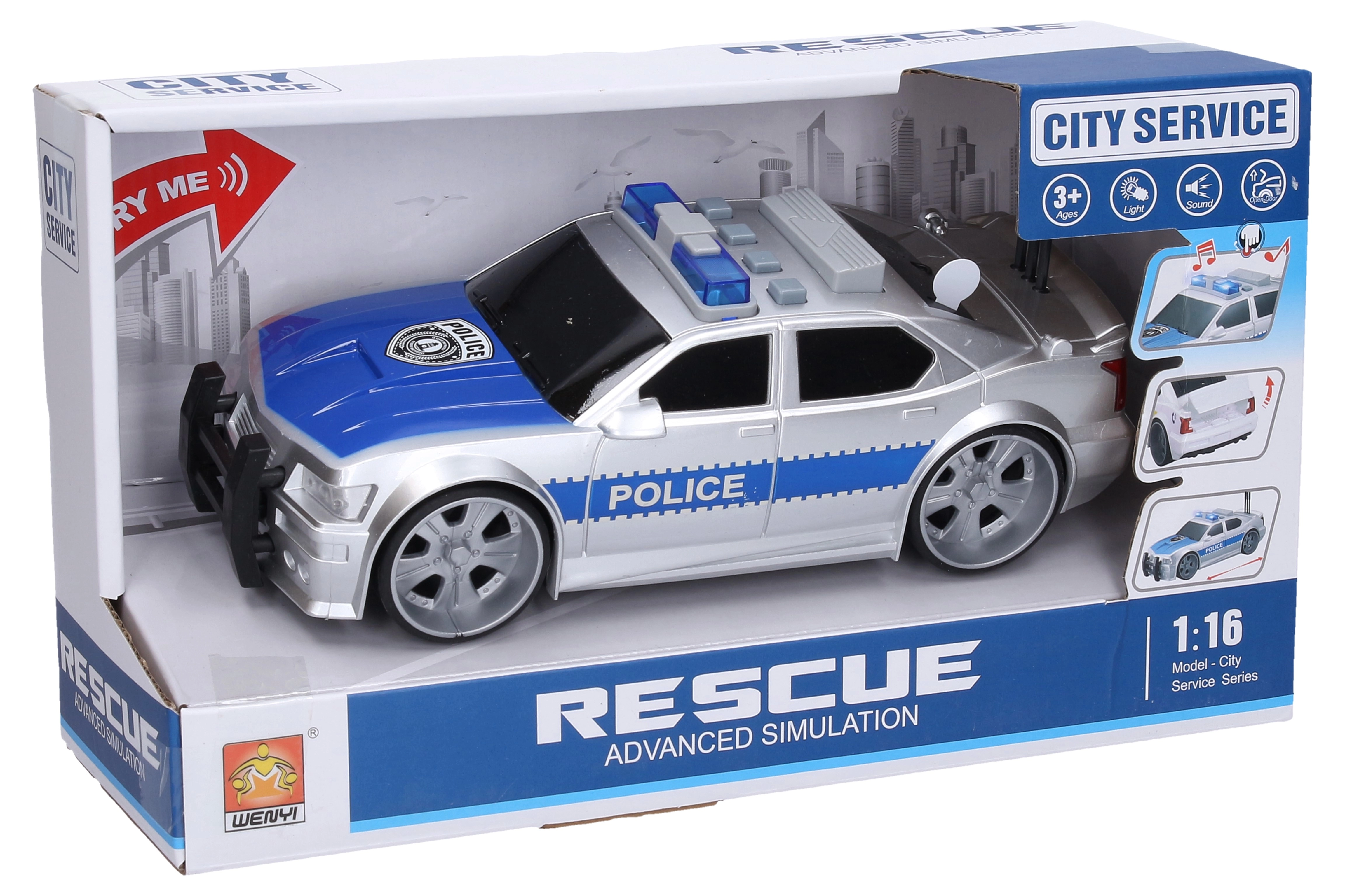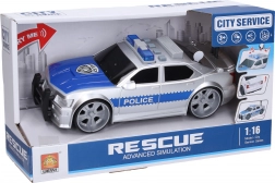 Wyrusz do akcji z detalicznie odwzorowanym policyjnym autem o długości 27 cm. Dzięki napędowi ciernemu pojazd łatwo się rozpędza, a realistyczne efekty świetlne i dźwiękowe (silnik, cofanie, klakson, sygnały świetlne) potęgują wrażenia z każdej interwencji. Maska otwiera się po prostym naciśnięciu przycisku na dachu.