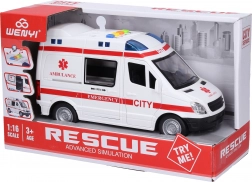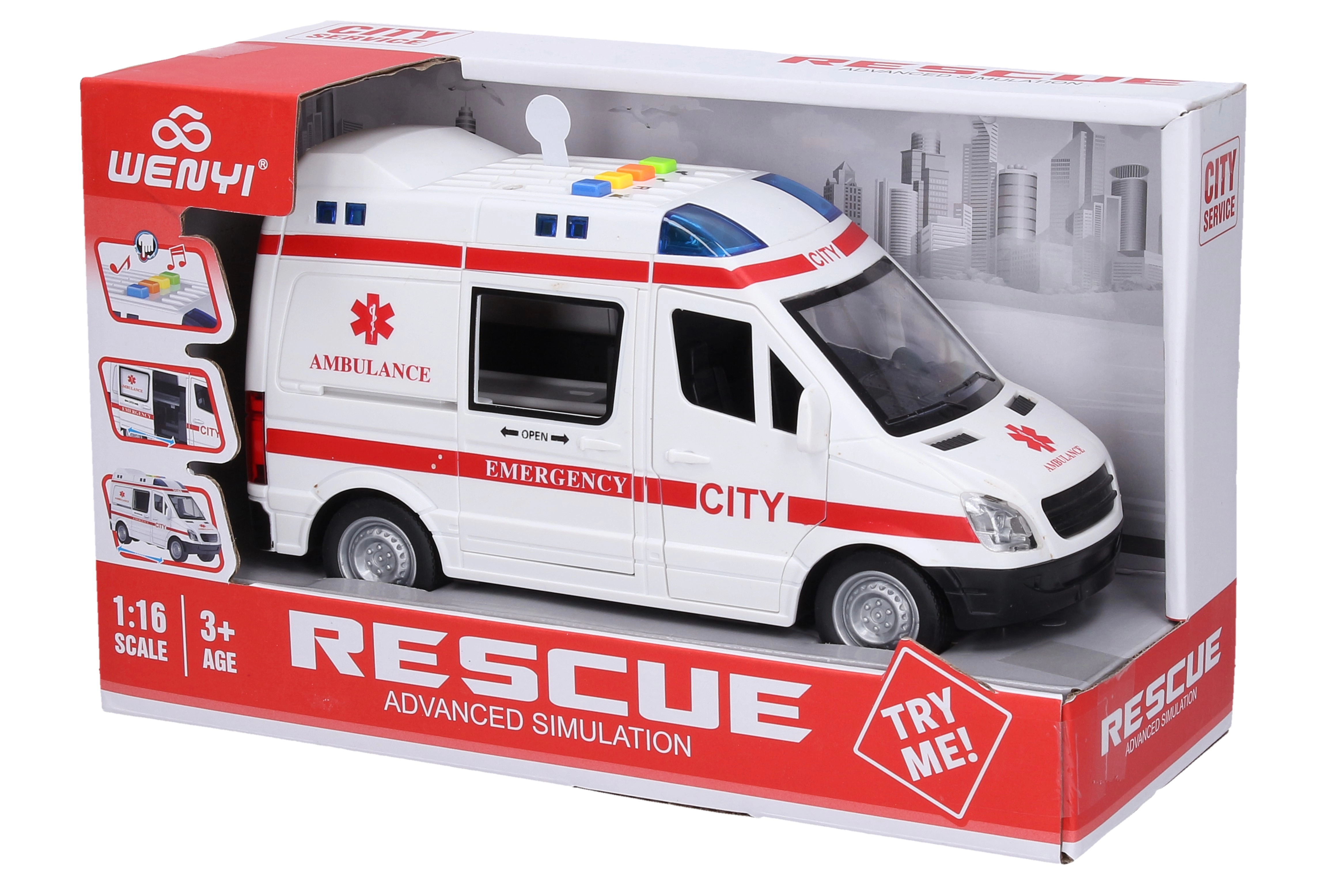 Realistyczna karetka na napęd typu friction (napęd inercyjny) o długości 21 cm ze świetlnymi i dźwiękowymi efektami. Oferuje otwierane przednie oraz przesuwne tylne drzwi dla jeszcze większej zabawy. Baterie 3× AG13 są dołączone do zestawu, więc dzieci mogą bawić się od razu po rozpakowaniu.