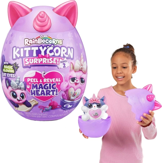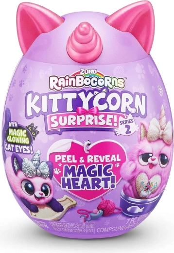 Zanurz się w niespodziankach z RAINBOCORNS KITTYCORN SURPRISE. W fioletowym jajku czeka mięciutki pluszowy kotek z rogiem jednorożca, odpinanym serduszkowym medalionem i losowymi akcesoriami, które pobudzają wyobraźnię i twórczą zabawę.