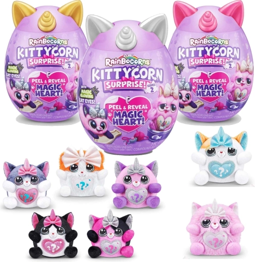 Odkryj magiczny świat RAINBOCORNS KITTYCORN SURPRISE – mięciutkiego pluszowego kotka z rogiem jednorożca i tajnymi akcesoriami ukrytymi w jajku. Każde opakowanie przynosi radość z rozpakowywania, wymianę dodatków i kreatywną zabawę. Świetny prezent dla dzieci od 3 lat oraz kolekcjonerska seria 7 różnych pupili.