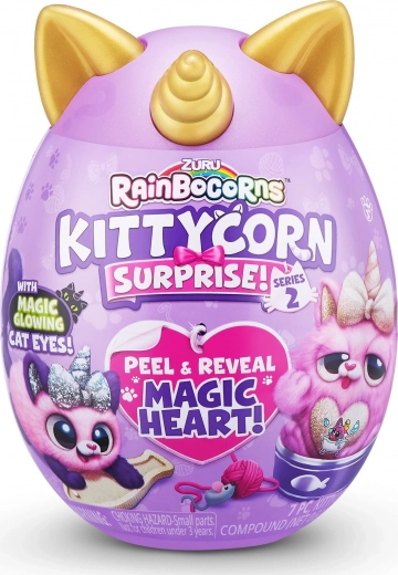 Rainbocorns S2 przynosi kolejną falę słodkości w postaci kotek ukrytych w jajku. Po otwarciu czeka na Ciebie jedna z 7 pięknych kotek z mięciutkim pluszem i błyszczącym sercem na piersi – po starciu dowiesz się, co Twoje kociątko kocha. Zgaś światła i zobacz, jak ich kocie oczy świecą w ciemności!