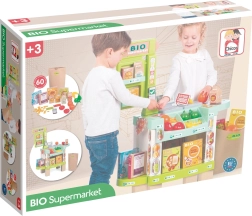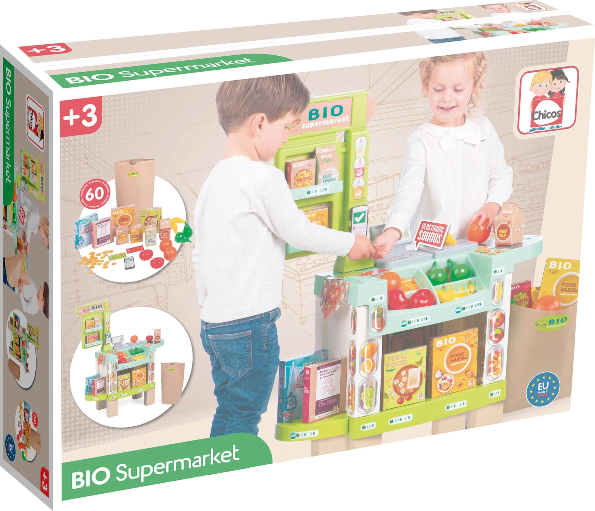 Dziecięcy supermarket BIO CHICOS zamieni pokój w mały sklep, w którym dzieci wypróbują role sprzedawcy i klienta. Bogaty zestaw 60 akcesoriów, w tym owoce, pudełka z żywnością, skaner i terminal płatniczy, wspiera zabawę w odgrywanie ról oraz rozwój komunikacji, motoryki małej i logicznego myślenia.