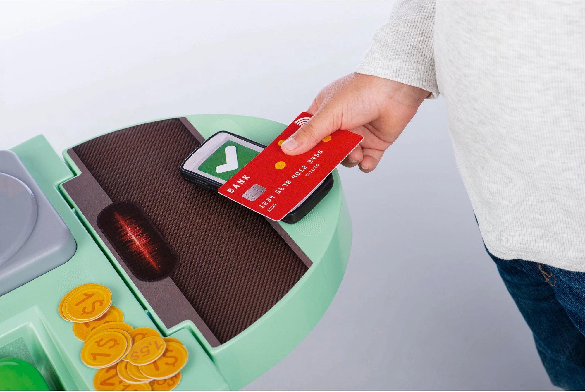 - Realistyczna zabawa w sklep – skanowanie towarów, płatność kartą i segregowanie zakupów.