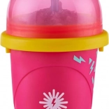 - Różowy z żółtym wieczkiem i niebieską słomką