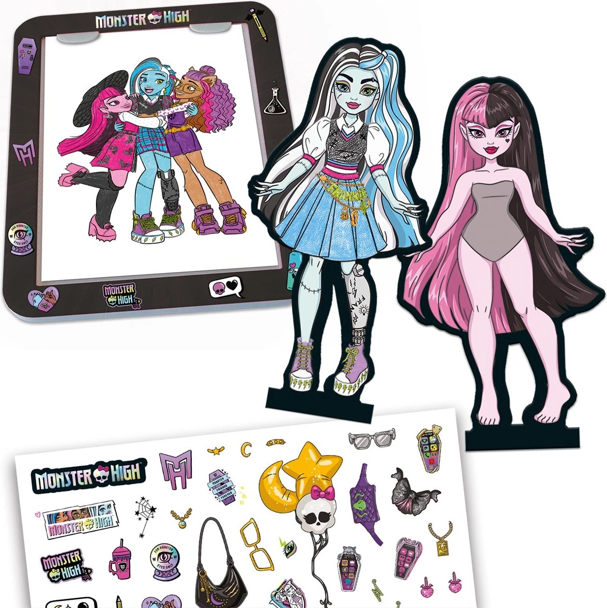 - 4 figurki MONSTER HIGH, 1 świecąca podkładka (tablet), 4 podstawki pod figurki, 1 ołówek, 1 arkusz naklejek, 32-stronicowa broszura z materiałami do odrysowywania, 1 scena, instrukcja