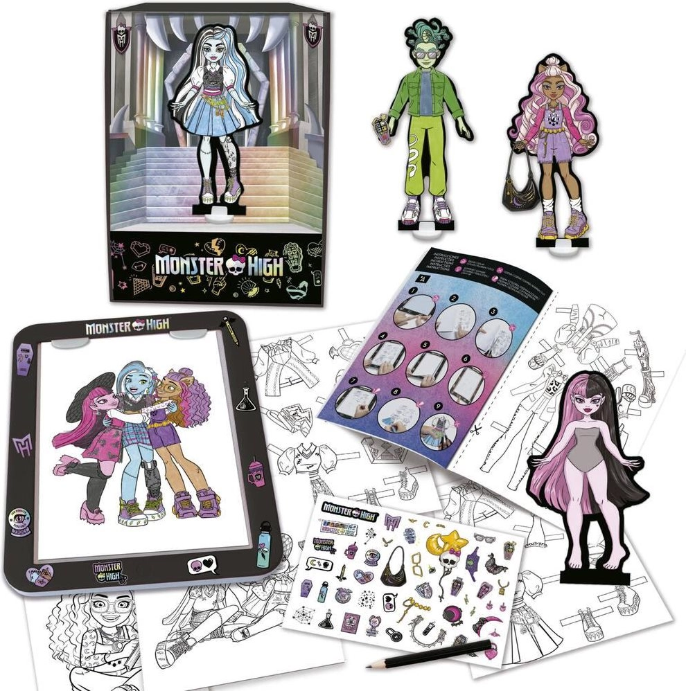 Odkryj zabawny kreatywny zestaw, dzięki któremu dzieci zaprojektują własne modowe stylizacje dla figurek MONSTER HIGH, korzystając z tabletowej podkładki z podświetleniem. Zestaw rozwija wyobraźnię i kreatywność, wspiera motorykę małą oraz trenuje koncentrację i cierpliwość. W komplecie znajduje się wszystko, co potrzebne do projektowania, odrysowywania, kolorowania i zdobienia – a pudełko można zamienić w wybieg do finałowego pokazu mody.