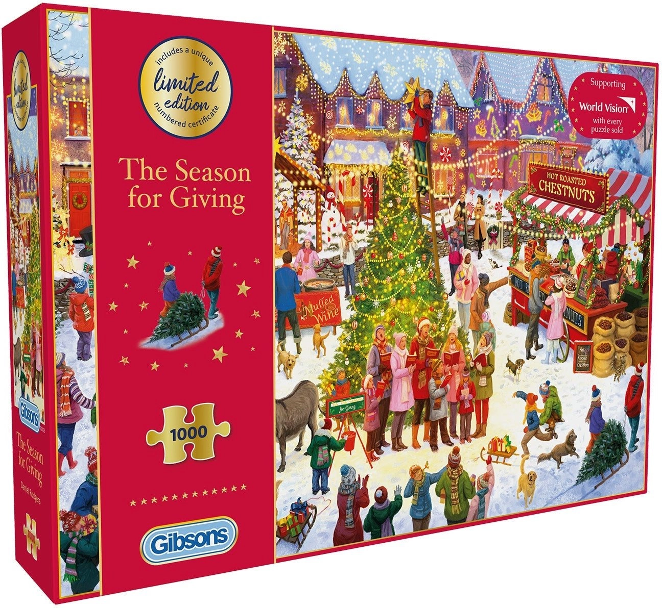 Poczuj świąteczną atmosferę z limitowaną układanką marki GIBSONS. Motyw „Czas obdarowywania” z 1000 elementami oferuje przyjemne wyzwanie, a po ułożeniu tworzy obraz o wymiarach ok. 49 × 68 cm – idealny do relaksu i jako prezent dla miłośników puzzli.