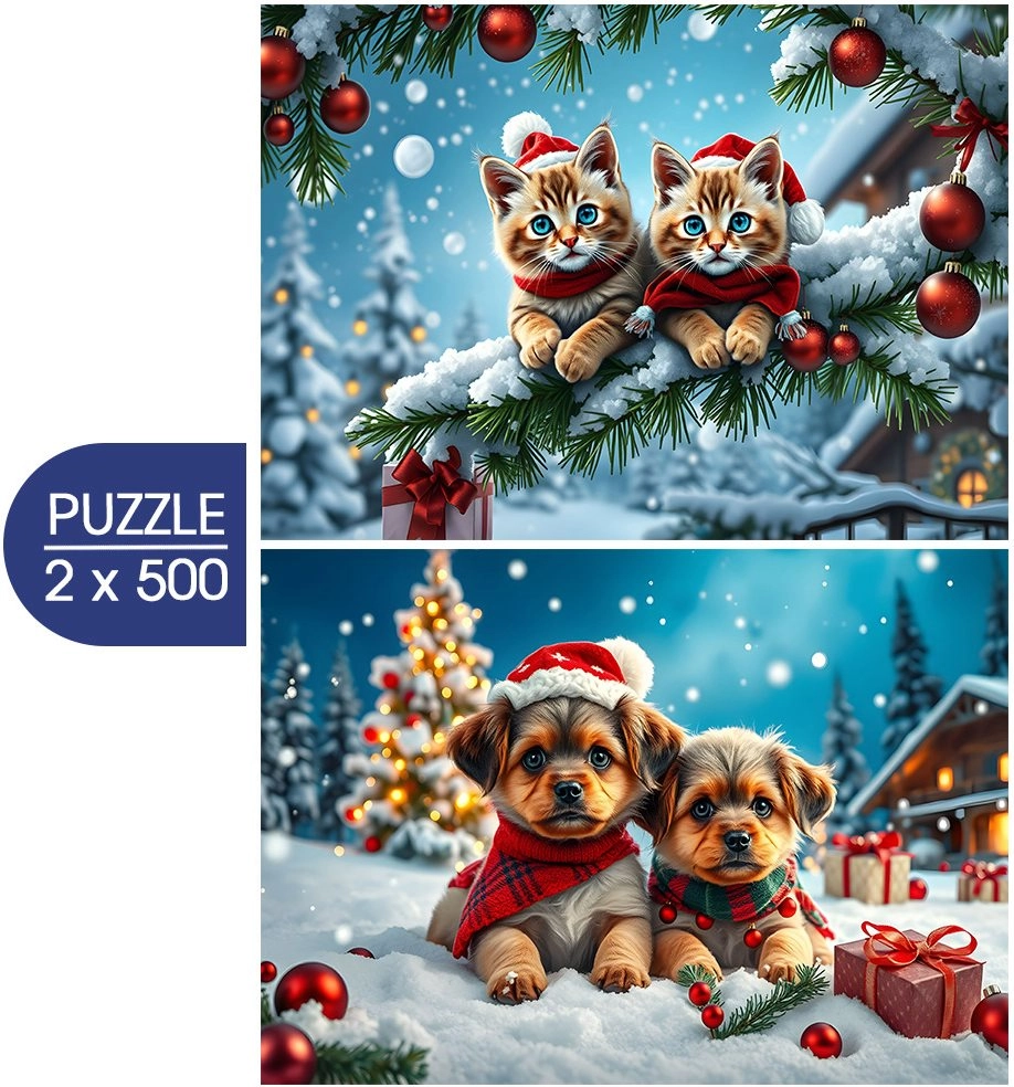 Ciesz się świąteczną zabawą z uroczymi motywami – zestaw zawiera dwa wysokiej jakości puzzle po 500 elementów z motywami świątecznych kociąt i szczeniąt. Idealne na spokojne chwile w domu, rozwijanie cierpliwości i wspólne układanie. Po ułożeniu każdy obrazek ma wymiary ok. 47,8 × 34,2 cm.