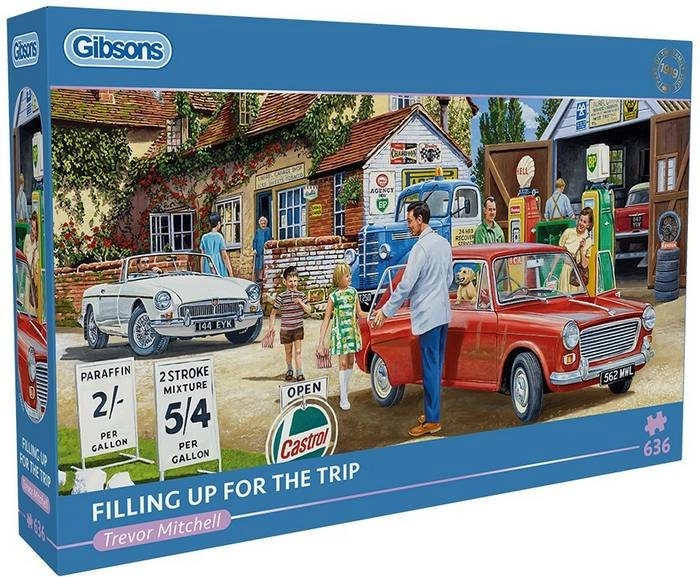 Panoramiczne puzzle GIBSONS „Tankowanie przed podróżą” to idealny wybór dla miłośników dopracowanych ilustracji i spokojnego relaksu. Dzięki 636 solidnym elementom doświadczysz płynnego układania, a na końcu nagrodzi Cię imponująca scena z atmosferą podróży.