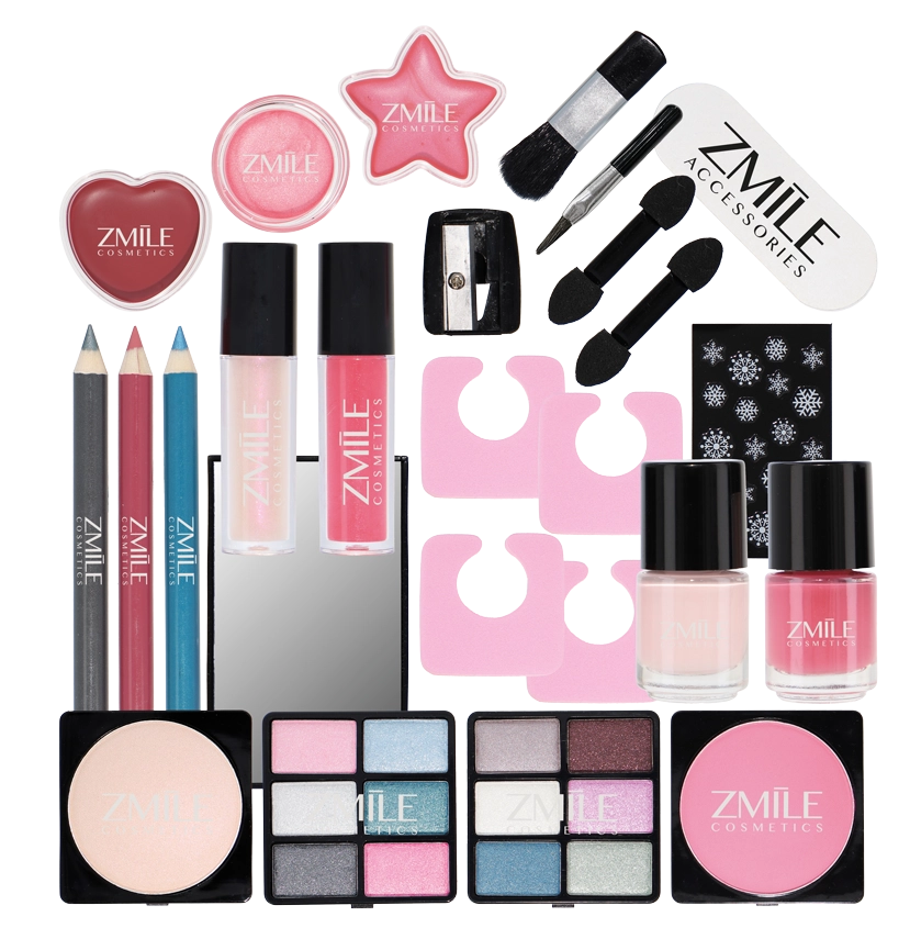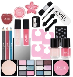- Błyszczyki do ust, róż, cienie do powiek, konturówki/kredki do oczu i ust, temperówka, separator do paznokci, pilnik, aplikatory do cieni, pędzelek, lakiery do paznokci, naklejki na paznokcie