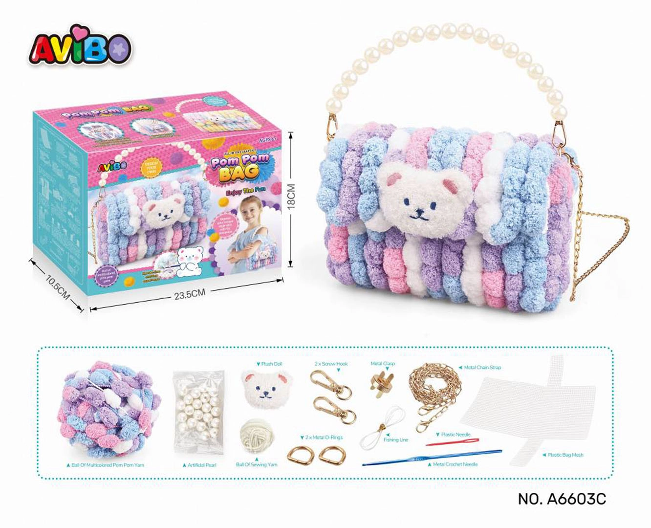 Zawartość opakowania: sznurek z pomponami, zapięcie, koraliki, sznurek, haczyki, łańcuszek, włóczka, szydełko, igła, główka misia, plastikowa forma do torebki, instrukcja.