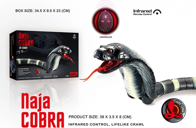 Realistyczny wąż RC COBRA dla dzieci od 6 lat zachwyca naturalnym ruchem i efektami. Porusza się w trzech kierunkach (do przodu, w prawo, w lewo), pełza jak prawdziwy wąż, wysuwa język i ma podświetloną paszczę. Ogon z 21 segmentów zapewnia płynny i szybki ruch. Sterowanie na częstotliwości 2,4 GHz za pomocą pilota w kształcie jajka. Akumulator 3,7 V do ładowania w zestawie, podobnie jak baterie do pilota.