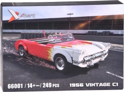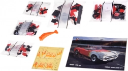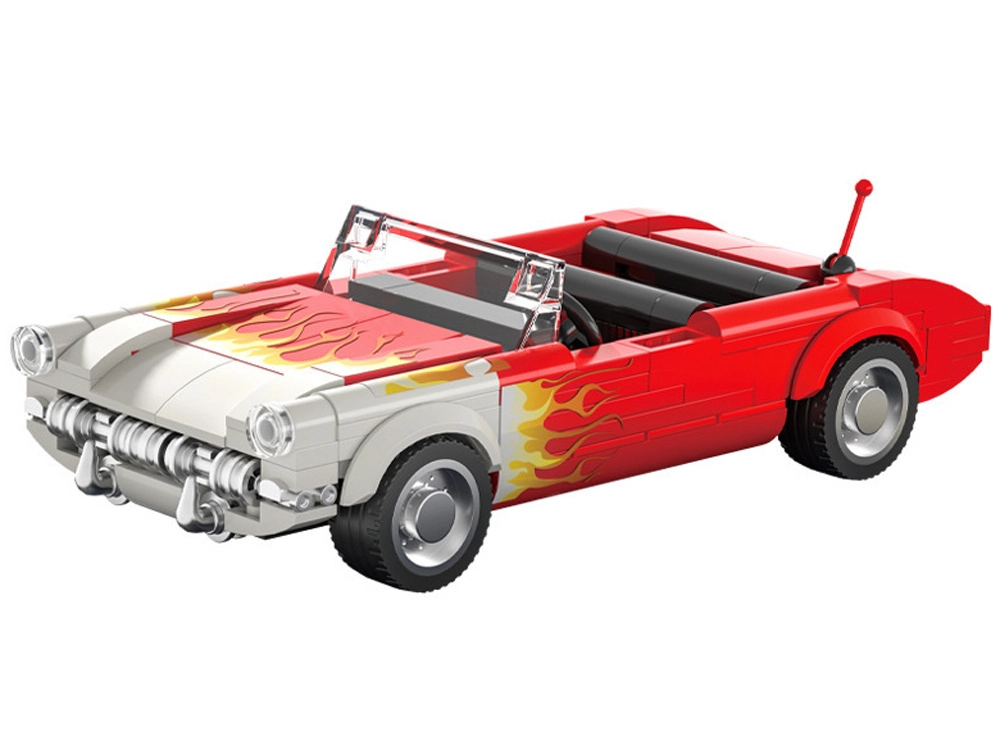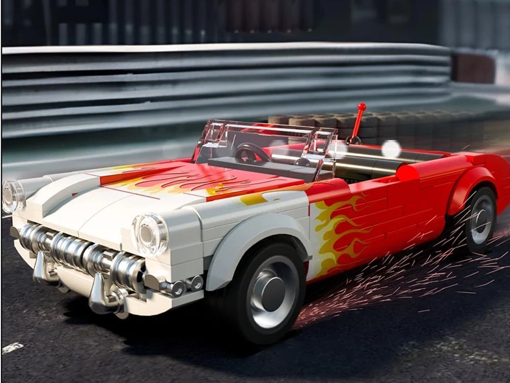 Czerwono-biały roadster z płomieniami, otwartym kokpitem i dopracowaną atrapą przodu oddaje klimat klasycznych amerykańskich aut z lat 50.
